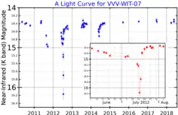 The star was found by the "Vista Variables in the Via Lactea" (VVV) project, which is a survey of European Southern Observatory (ESO) variability of the innermost bulge of the Milky Way galaxy. The near-infrared spectra of VVV-WIT-07 appear without features, without prominent emission or absorption lines. The characteristics found in the light curve of VVV-WIT-07 (WIT refers to "What Is This?") are similar to those seen in J1407 (Mamajek's Object), a pre-MS K5 dwarf with a ring system that eclipses the star or, alternatively, to Tabby's star, an F3 IV/V star that shows irregular and aperiodic obscurations in its light curve.[1][4][5][6][7][8][3]