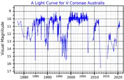 In 1896 it was announced that Evelyn Leland and Williamina Fleming had discovered that the star is a variable star.[11] The visual apparent magnitude of V CrA has been observed to vary between magnitudes 9.4 and 17.9. A maximum magnitude of 8.3 has been estimated from photographic plates.[12] It has around 60% the mass of the Sun and an effective (surface) temperature of around 6250 K.[6]