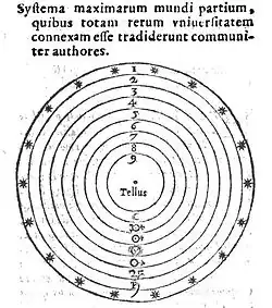 In 1573 Naboth published an astronomy textbook for gymnasium students Primarum de coelo et terra, which was dedicated to Stephen Báthory. There can be no doubt that Naboth was working from De revolutionibus orbium coelestium when he wrote this textbook, since in this book he provides schematics of the conventional model of the Solar System, Martianus Capella's geo-heliocentric model, as well as Copernicus' heliocentric model.[15] Tycho Brahe owned an early copy of this book, and since this book contains the first schematic representation of Capella's geo-heliocentric model it is likely that this book provided the inspiration for Tycho's geo-heliocentric model. Wittich may also have been influenced by Naboth's book in adopting the Capellan system to explain the motion of the inferior planets,[16] and Kepler may have used this book as well. In this book Naboth introduced the expression world system (systema mundi, mundanum systema, systema universitatis, and also systema coeleste, systema caelorum and systema aethereum),[17] a concept that was later adopted by Tycho, Kepler, and by Galilei as well.