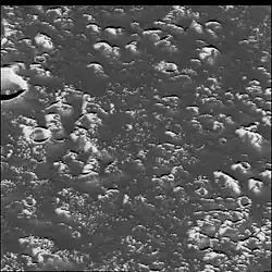 The inner ridge and trough zone surrounds the central palimpsest. The ridges that immediately surround the central zone have steep flanks facing outward. These scarps, when studied at a high resolution, turned out to be discontinuous consisting of a series of small bright knobs surrounded by the smooth dark material. They are obviously very degraded structures. The troughs that are situated further from the center than ridges are sinuous and appear to be graben (about 20 km wide). The inner trough zone extends up to 950 km from the center of Valhalla.[2]