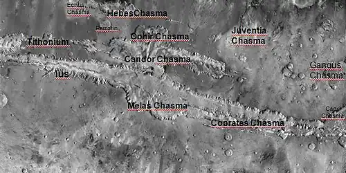 Further to the east from Oudemans, Ius and Tithonium chasmata are located parallel to each other, Ius to the south and Tithonium to the north. Ius is the wider of the two, leading to Melas Chasma. Ius has a ridge down the center of it by the name of Geryon Montes, composed of the undivided basement rock. The floor of Ius Chasma is mostly composed of pristine landslide material, not much degraded by cratering or erosion. The southern wall of Ius, and to a lesser extent the northern wall, has many short valleys stretching off roughly perpendicular to the line of the chasmas. These valleys have a stubby theater-headed leading edge very much like features seen on the Colorado Plateau near the Grand Canyon that appear from groundwater sapping. (Theater-headed means that, from above, the head of the valley is a well-defined U-shape). The valley is propagated by the continued erosion and the collapse of the wall.[16] Tithonium Chasma is very similar to Ius, except it is lacking the sapping features on the south side and contains a small portion of material that is similar to the smooth floor features except that it appears to be an ash fall that has been eroded by the wind. Between the two canyons, the surface is composed of younger fractured material - lava flows and faults from crustal extension of the Tharsis Bulge.[12]