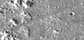 The valley floor is a flat, lava-flooded surface that is bisected by a slender, broken, cleft-like rille. The center rille is a challenging target for telescope observation from the Earth and described as, "notoriously hard to spot."[3] The rille itself is longer than the valley proper, at 196.65 km ± 10.98 km, and has a width of 0.58 km ± 0.09 km and depth of 77.69 m ± 28.07 m.[4]