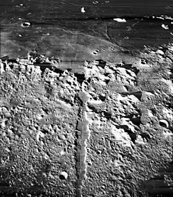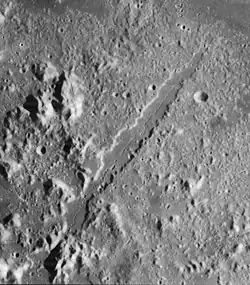 Vallis Alpes (Latin for "Alpine Valley")[2] is a lunar valley feature that bisects the Montes Alpes range. It extends 166 km from the Mare Imbrium basin, trending east-northeast to the edge of the Mare Frigoris. The valley is narrow at both ends and widens to a maximum width of about 10 km along the middle stretch. The selenographic coordinates of the center of this feature are 49°13′N 3°38′E / 49.21°N 3.63°E.[2]