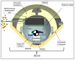 The 17 kg (37 lb) cone-shaped atmospheric probe measures just 40 cm (16 in) across, which was chosen to accommodate the electronics and the focal length of the nephelometer.[4] The probe outer mould line is a scaled-down version of the Deep Space 2 probe. Like the Deep Space 2 probe, the probe carries no parachute nor does it eject its heat shield. The nephelometer, flight computer, and radio are housed in a spherical titanium pressure vessel encased within a layer of insulation to protect the electronics and instrument from the corrosive Venusian atmosphere and maintain acceptable temperatures.[2]