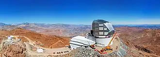 The Vera C. Rubin Observatory, formerly known as the Large Synoptic Survey Telescope (LSST), is an astronomical observatory under construction in Chile. Its main task will be carrying out a synoptic astronomical survey, the Legacy Survey of Space and Time.[11][12] The word "synoptic" is derived from the Greek words σύν (syn 'together') and ὄψις (opsis 'view'), and describes observations that give a broad view of a subject at a particular time. The observatory is located on the El Peñón peak of Cerro Pachón, a 2,682-meter-high (8,799 ft) mountain in Coquimbo Region, in northern Chile, alongside the existing Gemini South and Southern Astrophysical Research Telescopes.[13] The LSST Base Facility is located about 100 kilometres (62 miles) away from the observatory by road, in the city of La Serena. The observatory is named for Vera Rubin, an American astronomer who pioneered discoveries about galactic rotation rates.