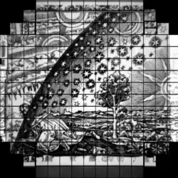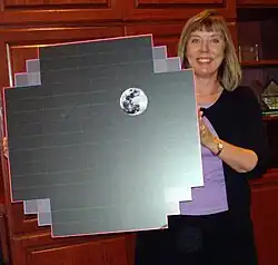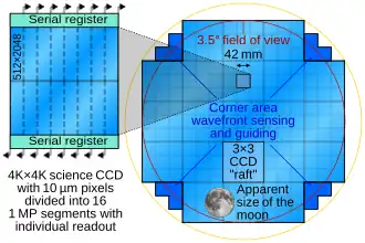 The camera focal plane is flat and 64 cm in diameter. The main imaging is performed by a mosaic of 189 CCD detectors, each with 16 megapixels.[47] They are grouped into a 5×5 grid of "rafts", where the central 21 rafts contain 3×3 imaging sensors, while the four corner rafts contain only three CCDs each, for guiding and focus control. The CCDs provide better than 0.2-arcsecond sampling, and will be cooled to approximately −100 °C (173 K) to help reduce noise.[48]