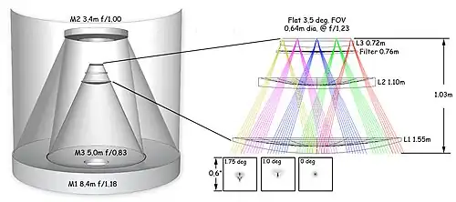 The telescope's primary mirror (M1) is 8.4 meters (28 ft) in diameter, the secondary mirror (M2) is 3.4 meters (11.2 ft) in diameter, and the tertiary mirror (M3), inside the ring-like primary, is 5.0 meters (16 ft) in diameter. The secondary mirror is expected to be the largest convex mirror in any operating telescope, until surpassed by the Extremely Large Telescope's 4.2-meter secondary in about 2028. The second and third mirrors reduce the primary mirror's light-collecting area to 35 square meters (376.7 sq ft), equivalent to a 6.68-meter-diameter (21.9 ft) telescope.[6] Multiplying this by the field of view produces an étendue of 336 m2⋅degree2; the actual figure is reduced by vignetting.[39]