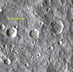 By convention these features are identified on lunar maps by placing the letter on the side of the crater midpoint that is closest to Vetchinkin.