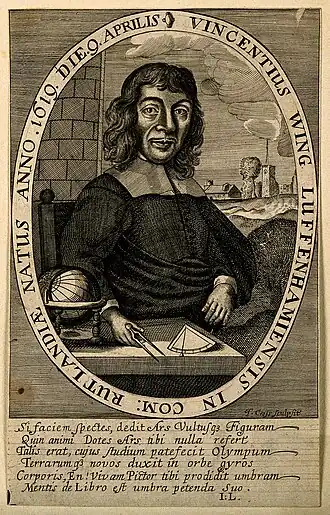 Vincent Wing was born at North Luffenham, Rutland on 9 April 1619.[1] The eldest of four sons of Vincent Wing (1587–1660) (who was taking astronomical observations during the 1620s[2]), his family had been established in the village since at least his grandfather's time, but is thought to have had Welsh antecedents. Wing did not receive a university education, but by assiduous study acquired his working knowledge of Latin, Greek, and Mathematics. With these skills he followed his calling as a surveyor, and invented or developed the use of the forty-link two-pole chain for measuring tracts of land in rods or poles, a method which he explained and advocated in his published works.[1] While so engaged, two of his younger brothers, Solomon (1621) and Samuel (1626), married during the earlier 1640s and began their families, but the first of Vincent's children by his wife Alice to be christened at North Luffenham was Elizabeth, in November 1652.[3]