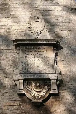 Vincent Wing resided with his wife Alice at North Luffenham, where daughters Mary (1654), Alice (1658), Elizabeth (1664) and Catherine (1666) and sons Vincent (1656) and James (1661), were christened.[31] He occasionally went to London for learned company. His friend and biographer John Gadbury commended his wit.[32] He drew the scheme of his own nativity published in Gadbury's Brief Relation, and is said to have made a correct forecast of his death. He contracted consumption, of which he died on 20 September 1668, aged 49, having made his will only a fortnight previously. Gadbury observed that dedication to work had exhausted him, and rebutted any suggestion that Wing might have taken his own life.[33] He was buried at North Luffenham. The Latin verses accompanying his portrait in the Astronomia Britannica form an epigram which may be translated: