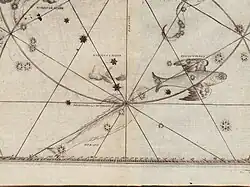 In 1603, Johann Bayer included the constellation in his star atlas Uranometria under the name Piscis Volans, the flying fish.[3] John Herschel proposed shrinking the name to one word in 1844, noting that Lacaille himself had abbreviated his constellations thus on occasion.[4] This was universally adopted.[3]