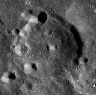 This crater has been heavily worn by subsequent impacts, leaving the rim and interior battered and cratered. There is a small crater attached to the exterior of the rim to the southeast, and the remains of a similar-sized crater along the southern edge. Small craterlets lie across the northwest, west, and southwestern rim edges. The remaining rim edge is rounded from impact erosion. A small craterlet lies almost at the crater midpoint.