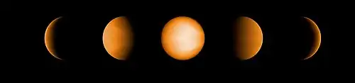 In 2021, the planetary atmosphere was revealed to be slightly more blue and less absorbing, which may be an indication of planetary weather patterns.[22] By mid-2021, the presence of ions of iron, chromium, vanadium and calcium in the planetary atmosphere was confirmed.[23] In 2022, ionized barium was also detected.[24] By 2022, an absence of titanium in the planetary atmosphere was confirmed and attributed to the nightside condensation of highly refractory titanium dioxide.[25] Observations by HST from 2016-2019, published in 2024, confirmed variability in the atmosphere of WASP-121b.[26][27]