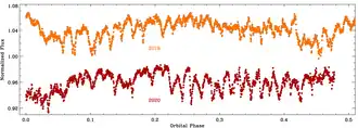 In 2022 it was reported that the flux of light coming from the star varies continually due to partial obscuring by a ring. The pattern of variation repeats with little change every 25.02 hours. There are dips in the light flux every 23 minutes, exactly 65 per period of 25.02 hours. The explanation of this strong 65th harmonic is unknown and the authors of the paper say that the phenomenon is puzzling. It seems to be caused by clumps of matter orbiting the star.[5][1] The researchers have hypothesized that the clumps are being influenced by a moon-sized object, possibly an exoplanet. If it has a period of 25 hours then it is orbiting in the habitable zone of the system. If this is confirmed, it would be the first time that a planet has been found orbiting in the habitable zone of a white dwarf.[5][6]