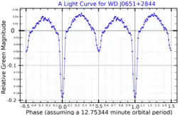 WD J0651+2844 is a white dwarf binary star system composed of two white dwarfs.[2] They are approximately 120,000 km apart and complete an orbit around their barycenter in less than 13 minutes.[1] This produces an eclipse every 6 minutes. This makes it possible to gather enough data to produce extremely accurate predictions of each future eclipse. The eclipse times deviate from the time predicted in a way consistent with gravitational waves.[3][4][5]