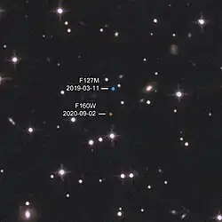 ![]() WISE 1639-6847 in near-infrared with Hubble. It shows the brown dwarf moving within 1 ½ years Credit: Hubble Space Telescope; Fontanive et al. | |