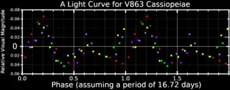 ![]() A visual band light curve for V863 Cassiopeiae, adapted from Chené et al. (2008).[1] The data were taken from November 2003 to February 2004, and different cycles are shown with different colors. | |