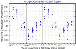 WR 140 is listed as a Wolf–Rayet variable star, and has been given the variable star designation V1687 Cyg in the General Catalogue of Variable Stars, whose visual brightness varies only very slightly.[6] Interest with this WR 140 system is principally observing the infrared light fluctuations during the component's orbit, being extensively studied because of its episodic dust formation.[15] It is now regarded as the prototype colliding-wind binary.[10]