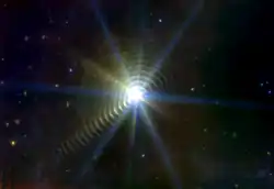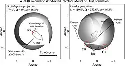 Shortly after periastron passage every eight years, the infrared brightness increases dramatically and then slowly drops again over a period of months.[7] Here stellar winds collide with the dust formation created by the Wolf–Rayet star, causing the unusual bulges and angles in the concentric shells of dust.[10] The dust typically emitted by Wolf–Rayet systems is not so coherent or concentric as those of WR 140. The dust lanes around Wolf–Rayets are most commonly observed as some variety of spiral. This is thought to be the result of the dueling solar winds in binary systems, which compress clouds of dust into distinct shock fronts. The concentric nature of WR 140's dust shells is not well understood, although it may be related to nuclear processes in the Wolf–Rayet star's core.
