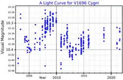 ![]() A visual band light curve For V1696 Cygni, plotted from INTEGRAL Optical Monitoring Camera (OMC) data[1] | |