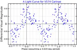 Eric Gosset et al. announced that WR 30a is a variable star, in 2001.[4] It was given its variable star designation, V574 Carinae, in 2003.[17] WR 30a shows regular and continuous brightness variations of 0.02 magnitudes with a stable period of 4.6 days. These are ascribed to the orbital motion and to the deformed shapes of the two stars. In addition, the system shows occasional very rapid brightness of up to 0.2 magnitudes. These brightness changes have only been seen at visual wavelengths and last for only a few hours. At blue wavelengths the variations are either not seen, or sometimes a small opposite brightness change. They are not predictable but there is a possible period around three days. The cause of these brightness changes is completely unknown.[18]
