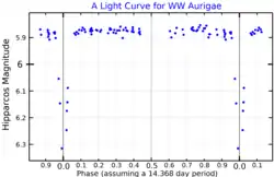 This is a double-lined[4] spectroscopic binary system, having a circular orbit with a period of 2.5 days.[6] It was discovered to be variable independently by Friedrich Schwab[10] and Heinrich Van Solowiew in 1918.[11] It was given its variable star designation in 1919.[12] Both components are metallic-lined, or Am stars, with a spectrum showing a deficiency of calcium and scandium, and an overabundance of heavier elements.[13] Together they form an EA, or Algol-type, eclipsing binary with the primary occultation reducing the net magnitude to a minimum of 6.54 and the secondary eclipse lowering it to 6.43, over a cycle time of 2.52501936 days.[5]