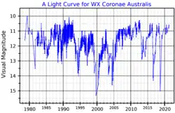 WX Coronae Australis was first reported to be variable in 1928 after it was detected on two different photographic plates at magnitudes 12.2 and 16.0. It was catalogued as HV (Harvard Variable) 4119. The type of variability was not known at the time,[9] but in 1936 its spectrum was measured as R5 and it was tentatively classified as an R CrB star.[10] By 1996 it had been observed to fade 13 times at an average interval of 2,000 days.[11]