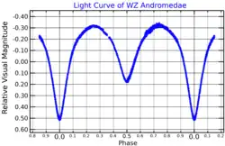 WZ Andromedae (abbreviated to WZ And) is an eclipsing binary star in the constellation Andromeda. Its maximum apparent visual magnitude is 11.6,[4] but drops down to 12.00 during the main eclipse which occurs roughly every 16.7 hours.[3]