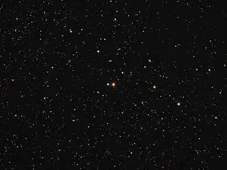 WZ Cassiopeiae (WZ Cas) is a deep red hued star in the northern constellation of Cassiopeia. It is a variable star with a magnitude that ranges from 6.3 down to 8.8,[3] placing it near the limit of naked eye visibility at peak magnitude. The estimated distance to this star, as determined from its annual parallax shift of 2.1 mas,[2] is about 1,540 light years. It is moving closer to the Earth with a heliocentric radial velocity of −34 km/s.[7]