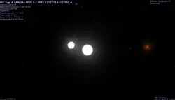 WZ Cephei is an eclipsing binary star of W Ursae Majoris-type in the constellation of Cepheus, located 880 light years away from the Sun. The stars orbit around a common orbital barycenter every 0.41744 days (slightly over 10 hours). Timing analyses have revealed the possible presence of a third low-mass stellar companion in a wide orbit.[3]