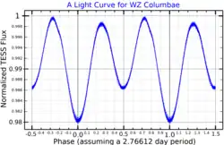 The star was discovered to be a variable star when the Hipparcos data was analyzed. It was given its variable star designation in 1999.[20] WZ Columbae was originally listed as a slowly pulsating B-type star by the General Catalogue of Variable Stars. However, observations from Hempel & Howlger (2003) reveal it to be overabundant in strontium and barium.[14] Combined with Hipparcos photometry, this led to the object being reclassified as an Alpha2 Canum Venaticorum variable.[8] Based on data collected in the Hipparcos passband, it fluctuates between magnitudes 5.27 and 5.29 over 1.38 days.[7][21] However, TESS data suggests a period of 2.76618±0.00004 days; double that of the earlier data.[16]