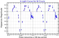 W Crucis varies in brightness between magnitude 8.18 and 9.01 over a period of 198.5 days. Its light curve has been observed to be asymmetric with subsequent maxima differing in height, which is described as the so-called O'Connell effect.[10] A secondary minimum is observed when the brightness drops to magnitude 8.5. The shape and duration of the eclipses show that the two stars are detached and that there is an accretion disk around the primary, more massive, star.[5]
