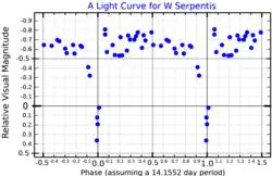 W Serpentis is an eclipsing binary star in the constellation Serpens. It is always too faint to be seen with the naked eye,[10] varying between apparent magnitudes 8.42 and 10.2 with a period of just over 14 days.[3] This is mainly due to eclipses; however, variations in its period indicate there are some innate changes in luminosity of one or both component stars as they interact with each other, and it has been difficult to disentangle the light to determine their nature.[11] The period is increasing by 14 seconds a year, indicating that a massive amount of material is being transferred from the larger fainter star to the smaller brighter one.[1]