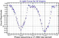 W Virginis is the prototype W Virginis variable, a subclass of the Cepheid variable stars. It is located in the constellation Virgo, and varies between magnitudes 9.46 and 10.75 over a period of approximately 17 days.[4]