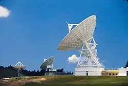 The Warkworth Space Centre is on land that was first developed for long-range telecommunications, operated by the New Zealand Post Office and opening on 17 July 1971.[2] The station, primarily connecting to fourth generation Intelsat satellites, was used for satellite telephone circuits and television, including the broadcast of the 1974 British Commonwealth Games, held in Christchurch.[2] The shallow valley site was chosen as it was sheltered from winds and radio noise, and the horizon elevation of only 5° allowed the station to be useful for transmissions to low orbit satellites.[2] The original 30-metre antenna was decommissioned on 18 June 2008 and demolished.[2]