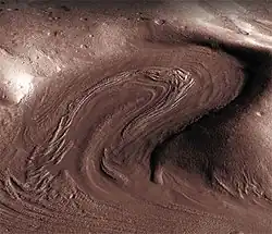 Geologic evidence of past water includes enormous outflow channels carved by floods,[39] ancient river valley networks,[40][41] deltas,[42] and lakebeds;[43][44][45][46] and the detection of rocks and minerals on the surface that could only have formed in liquid water.[47] Numerous geomorphic features suggest the presence of ground ice (permafrost)[48] and the movement of ice in glaciers, both in the recent past[49][50][51][52] and present.[53] Gullies and slope lineae along cliffs and crater walls suggest that flowing water may continue to shape the surface of Mars, although what was thought to be low-volume liquid brines in shallow Martian soil, also called recurrent slope lineae,[54][1] may be grains of flowing sand and dust slipping downhill to make dark streaks.[55]
