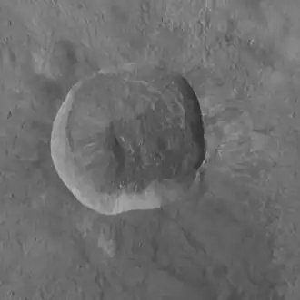 The crater has a bright ray system, as well as an unusual dark flow-feature associated with the southern rim. The flow-feature is interpreted as impact melt.[2]