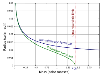 For a more accurate computation of the mass-radius relationship and limiting mass of a white dwarf, one must compute the equation of state that describes the relationship between density and pressure in the white dwarf material. If the density and pressure are both set equal to functions of the radius from the center of the star, the system of equations consisting of the hydrostatic equation together with the equation of state can then be solved to find the structure of the white dwarf at equilibrium. In the non-relativistic case, the radius is inversely proportional to the cube root of the mass.[46]: eqn.(80) Relativistic corrections will alter the result so that the radius becomes zero at a finite value of the mass. This is the limiting value of the mass – called the Chandrasekhar limit – at which the white dwarf can no longer be supported by electron degeneracy pressure. The graph on the right shows the result of such a computation. It shows how radius varies with mass for non-relativistic (blue curve) and relativistic (green curve) models of a white dwarf. Both models treat the white dwarf as a cold Fermi gas in hydrostatic equilibrium. The average molecular weight per electron, μe, has been set equal to 2. Radius is measured in standard solar radii and mass in standard solar masses.[46][61]