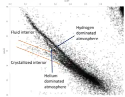 As a white dwarf core undergoes crystallization into a solid phase, latent heat is released, which provides a source of thermal energy that delays its cooling.[88] Another possible mechanism that was suggested to explain this cooling anomaly in some types of white dwarfs is a solid–liquid distillation process: the crystals formed in the core are buoyant and float up, thereby displacing heavier liquid downward, thus causing a net release of gravitational energy.[89] Chemical fractionation between the ionic species in the plasma mixture can release a similar or even greater amount of energy.[90][91][92] This energy release was first confirmed in 2019 after the identification of a pile up in the cooling sequence of more than 15000 white dwarfs observed with the Gaia satellite.[93]
