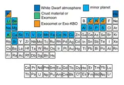 The most common observable evidence of a remnant planetary system is pollution of the spectrum of a white dwarf with metal absorption lines. 27–50% of white dwarfs show a spectrum polluted with metals,[154] but these heavy elements settle out in the atmosphere of white dwarfs colder than 20000 K. The most widely accepted hypothesis is that this pollution comes from tidally disrupted rocky bodies.[155][156] The first observation of a metal-polluted white dwarf was by van Maanen[17] in 1917 at the Mount Wilson Observatory and is now recognized as the first evidence of exoplanets in astronomy.[157] The white dwarf van Maanen 2 shows iron, calcium and magnesium in its atmosphere,[158] but van Maanen misclassified it as the faintest F-type star based on the calcium H- and K-lines.[159] The nitrogen in white dwarfs is thought to come from nitrogen-ice of extrasolar Kuiper Belt objects, the lithium is thought to come from accreted crust material and the beryllium is thought to come from exomoons.[157]