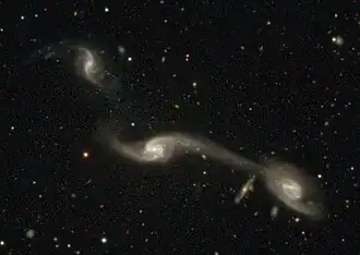 Wild's Triplet, also known as Arp 248, is a group of three small, interacting spiral galaxies.[1] The galaxies (PGC 36723, PGC 36733, PGC 36742) are visible in the constellation Virgo.[2] Two of the galaxies have a connecting stellar stream, probably formed as a result of gravitational tidal interactions. The trio is located some 200 million light-years away. The triplet is named after the Swiss astronomer Paul Wild (1925–2014), who studied the trio in the early 1950s.[3]