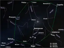 The stars in the hexagon are parts of six constellations. Counter-clockwise around the hexagon, starting with Rigel, these are Orion, Taurus, Auriga, Gemini, Canis Minor, and Canis Major.