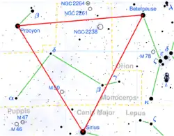 - ↑ Procyon-Sirius and Procyon-Betelgeuse are within 0.3° of one another but Sirius-Betelgeuse is significantly longer, so that the largest angle is 78.8°.