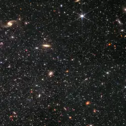 In 1994, A. E. Dolphin used the Hubble Space Telescope to create a color–magnitude diagram for WLM. It showed that around half of all the star formation in this galaxy occurred during a starburst that started ~13 Gyr ago. During the starburst, the metallicity of WLM rose from [Fe/H] ~ −2.2 to [Fe/H] −1.3. There being no horizontal-branch population, Dolphin concludes that no more than ~20 M per Myr of star formation occurred in the period from 12 to 15 Gyr ago. From 2.5 to 9 Gyr ago, the mean rate of star formation was 100 to 200 M per Myr.[5] Being at the edge of the Local Group has also protected WLM from interactions and mergers with other galaxies, giving it a "pristine" stellar population and state that make it particularly useful for comparative studies.[6]
