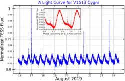 Wolf 1130AB is a periodic variable star with a period of 0.497 days and also a flare star, with the variable star designation V1513 Cygni. The flares occur due to material being occasionally accreted onto the surface of the white dwarf.[6] Three components cause the variability of Wolf 1130A:[3]