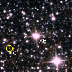 The outer companion Wolf 1130C (WISE J200520.38+542433.9) was discovered in 2013.[10] It has a temperature of 647 K (374 °C, 705 °F), a radius of 0.82 RJ and a mass of 44.9 MJ.[7] The brown dwarf has a low metallicity which causes an unusually low luminosity compared to other stars of the same mass, and it is therefore classified as a subdwarf. It is suspected that it orbited Wolf 1130AB in a closer orbit when Wolf 1130B was still a main-sequence star. When Wolf 1130AB became a common-envelope binary and Wolf 1130B later a white dwarf, the entire system lost 80% of its mass and forced Wolf 1130C into a more distant orbit of 3150 astronomical units.[3] New classification of T-type subdwarfs found a metallicity of [M/H]=−0.65+0.10