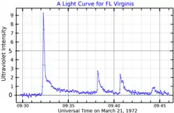 ![]() An ultraviolet band light curve for FL Virginis, adapted from Moffett (1972).[1] The plot shows intensity above the star's quiescent intensity. | |