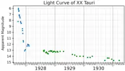 XX Tauri (Nova Tauri 1927) was a nova, which appeared in the constellation Taurus in 1927. It was discovered by Arnold Schwassmann and Arno Arthur Wachmann at Hamburg Observatory on an objective prism photographic plate taken on 18 November 1927. Subsequent examination of pre-discovery photographic plates taken at the Harvard College Observatory showed that the peak brightness, magnitude 5.9, occurred on 1 October 1927, at which point it may have been faintly visible to the naked eye.[5] By 1988 it had faded below magnitude 19.8.[6]
