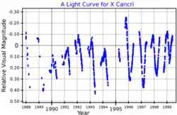 John Birmingham reported that the star's brightness was probably variable, in 1871.[11] In 1895, Thomas Espin confirmed that it is in fact a variable star.[12] It was listed with its variable star designation, X Cancri, in Annie Jump Cannon's 1907 work Second Catalog of Variable Stars.[11] This is a semiregular variable star of subtype SRb that ranges in brightness from visual magnitude 5.52 down to 7.50 with a period of 193 days.[2] Fourier analysis has shown that the star also pulsates with periods of 350 and 1,870 days.[13]