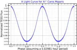 ξ1 Canis Majoris has the longest known rotation period of any B class star, taking around 30 years to complete one revolution on its axis.[9] This is thought to be due to magnetic braking; ξ1 Canis Majoris has the strongest magnetic field of any β Cephei star and would be expected to spin down completely in around four million years. It also has the strongest and hardest X-ray emission of any β Cephei star.[6]
